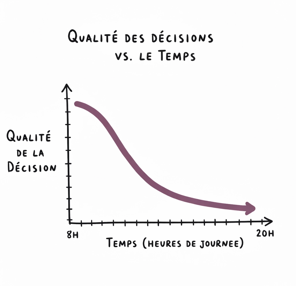C'est ce que le psychologue Roy Baumeister a mis en évidence avec son concept d'épuisement de l'ego : la capacité à prendre des décisions de qualité se dégrade au fil de la journée, à mesure que le cerveau consomme son énergie cognitive. C'est une question de biologie.